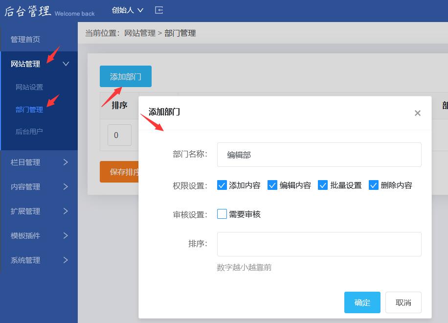 1、依次点击 网站设置(左侧菜单)—— 部门管理 ,在右侧 界面,点击 添加部门 例如 编辑部 如下图1所示