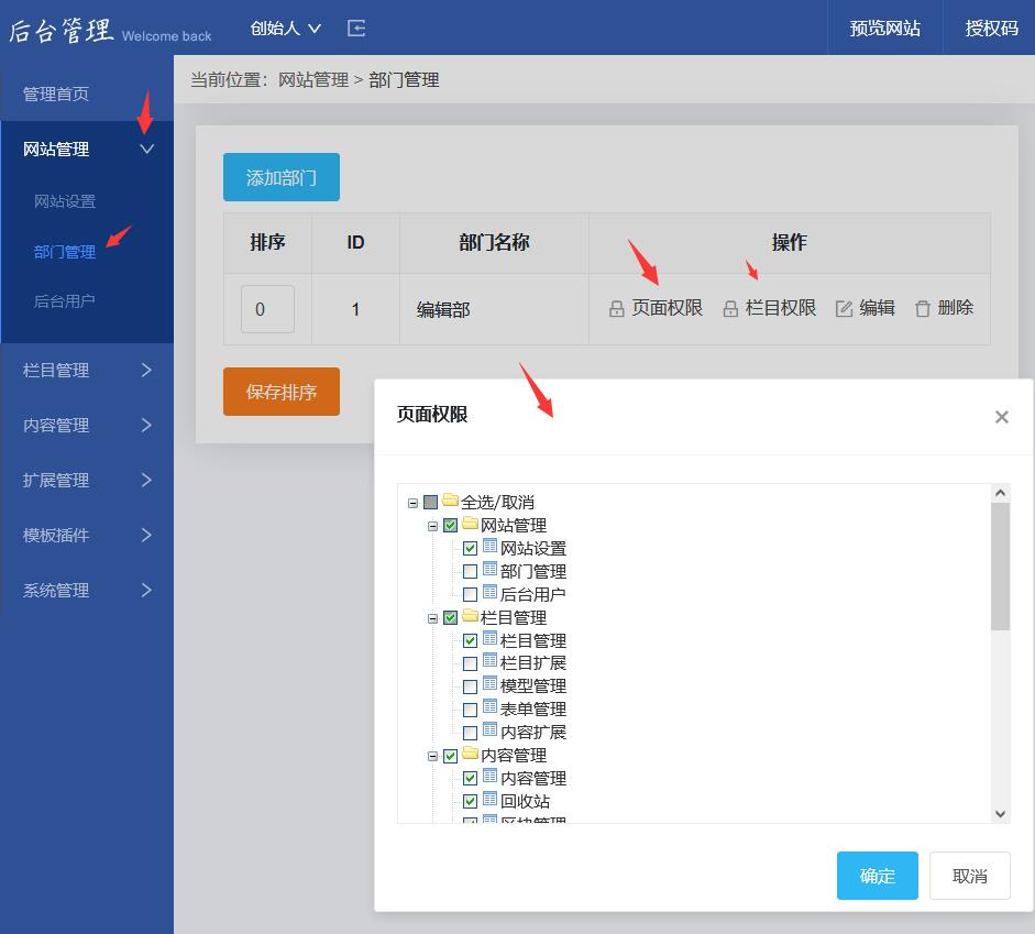 2、设置 刚才添加的部门,编辑部 的 页面权限(后台左侧菜单的权限)和 栏目权限(具体添加的栏目的相关权限)如下图2所示