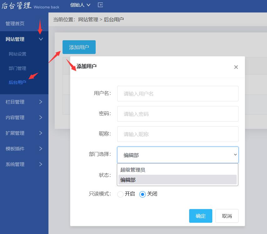3、依次点击 网站设置(左侧菜单)—— 后台用户 ,在右侧 界面,点击 添加用户 输入管理员信息后,部门选择为 编辑部 如下图3所示