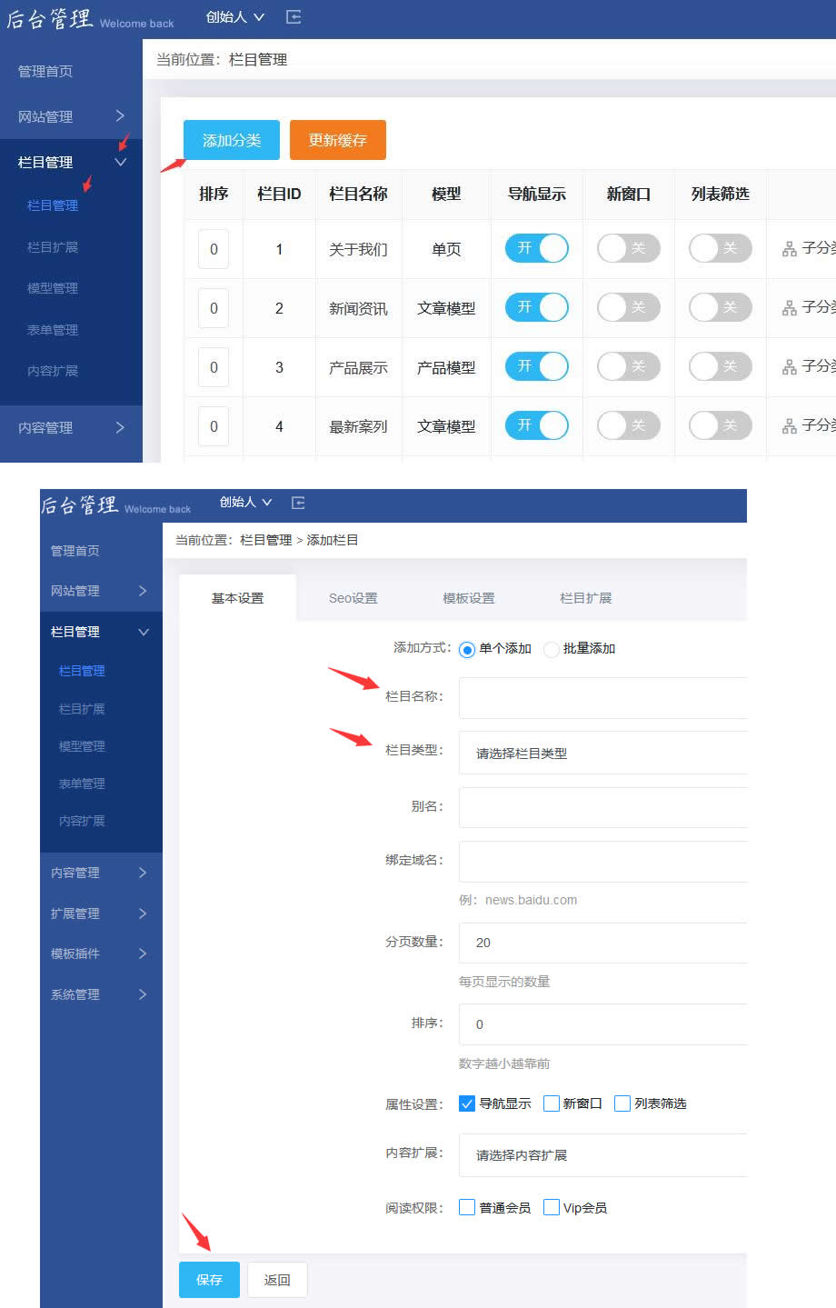 1、添加栏目,依次点击 栏目管理(后台左侧菜单)—— 添加分类(右侧按钮),随后,在打开的右侧窗口中,输入 栏目名称, 选择对应的 栏目类型 ,最后 点击 保存 按钮 即可。如下图1 所示。