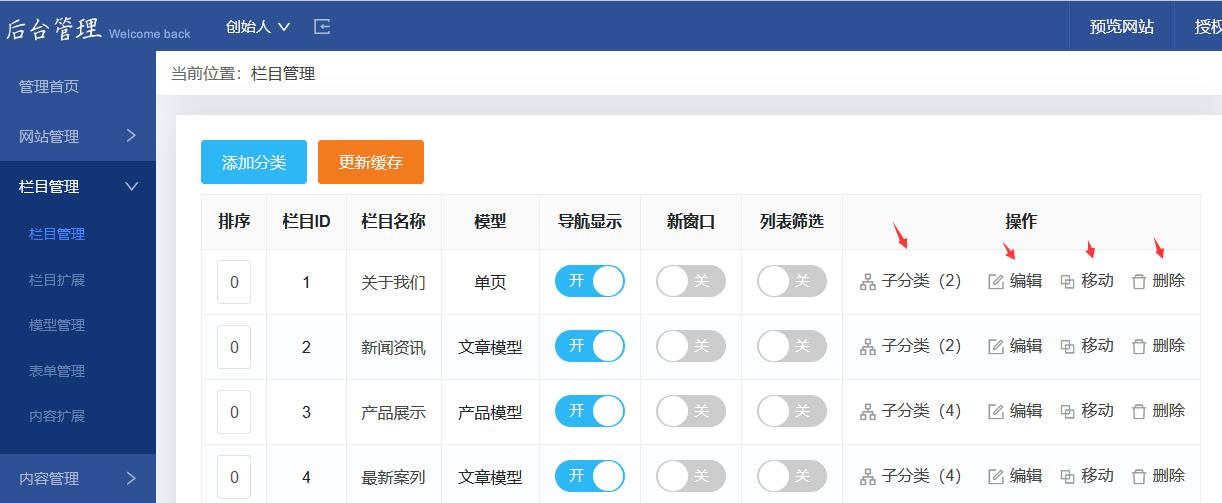 2、栏目编辑、移动、删除 点击 栏目管理(后台左侧菜单)—— 随后,在打开的右侧窗口中,选择对应栏目 后面的 编辑、移动、删除 即可 如下图2所示