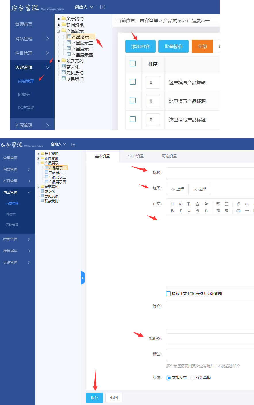 3、添加产品内容:依次点击 内容管理(后台左侧菜单)—— + (产品展示前面的+)—— 产品展示一,随后,在打开的右侧窗口中, 标题:、 图组:、 正文:、、 缩略图:输入 相关的信息, 最后 点击 保存 按钮 即可。如下图3 所示。