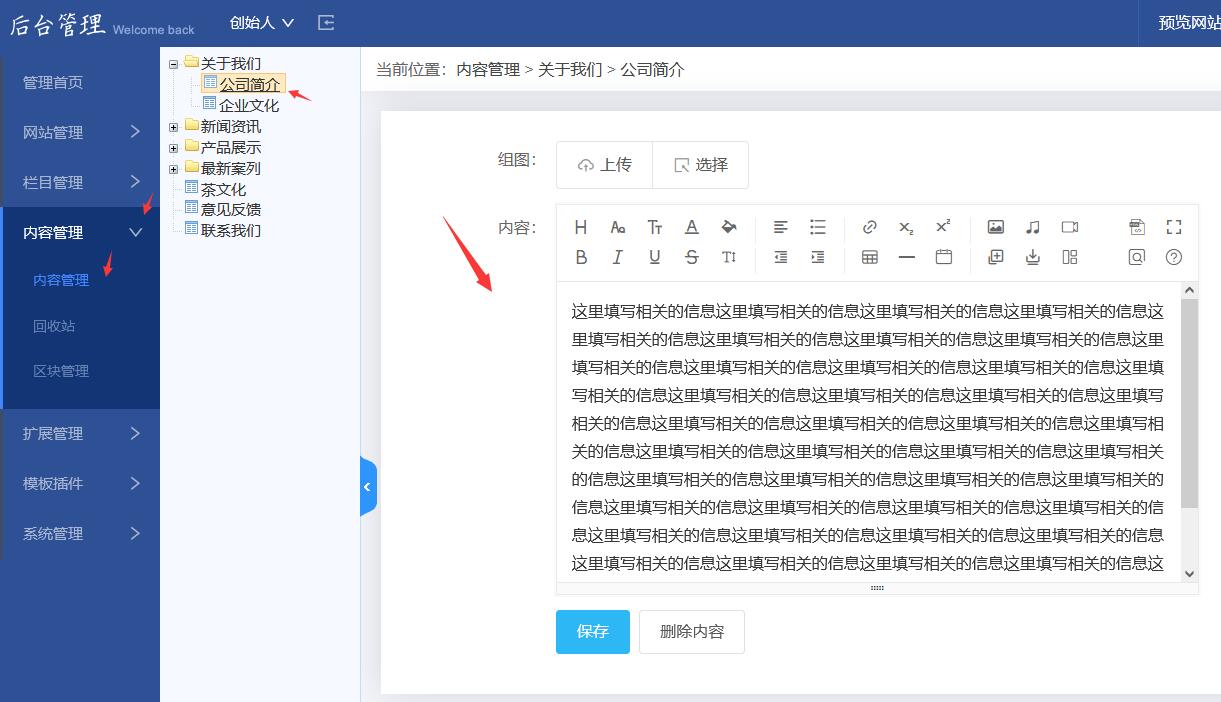1、添加单页/修改单页:依次点击 内容管理(后台左侧菜单)—— + (关于我们前面的+)—— 公司简介,随后,在打开的右侧窗口中, 内容输入 相关的信息, 最后 点击 保存 按钮 即可。如下图1 所示。