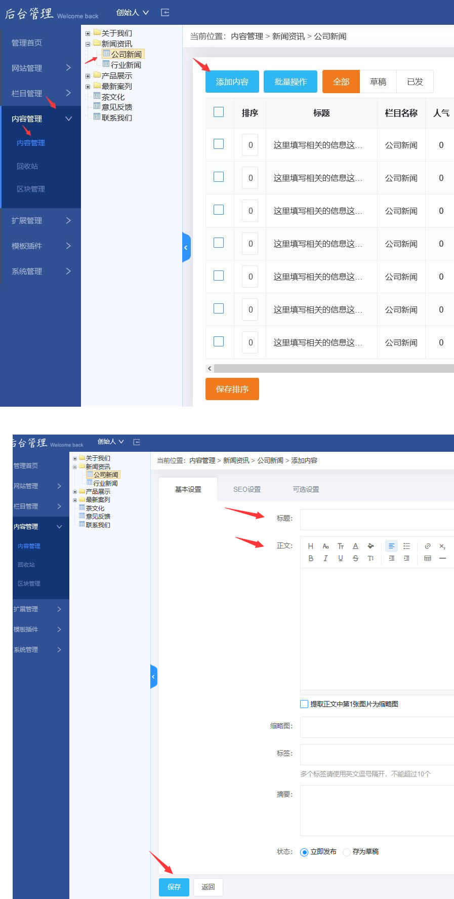 2、添加新闻内容:依次点击 内容管理(后台左侧菜单)—— + (新闻资讯前面的+)—— 公司新闻,随后,在打开的右侧窗口中, 标题:、 正文:输入 相关的信息, 最后 点击 保存 按钮 即可。如下图2 所示。