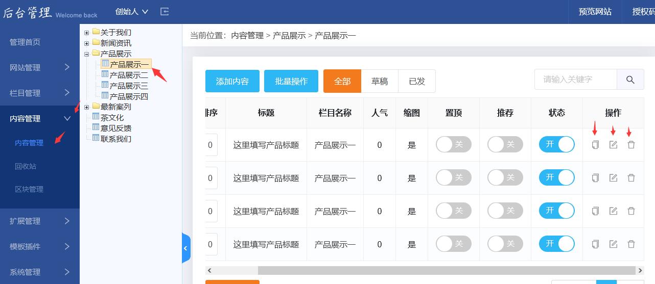 4、复制、修改、删除内容:这里以删除产品信息为例,依次点击 内容管理(后台左侧菜单)—— + (产品展示前面的+)—— 产品展示一,随后,在打开的右侧窗口中,找到相关的信息,在信息后面有3个小图标,他们分别,复制、编辑、删除; 点击 对应的小图标 ,可进行相关的操作。如下图4 所示。